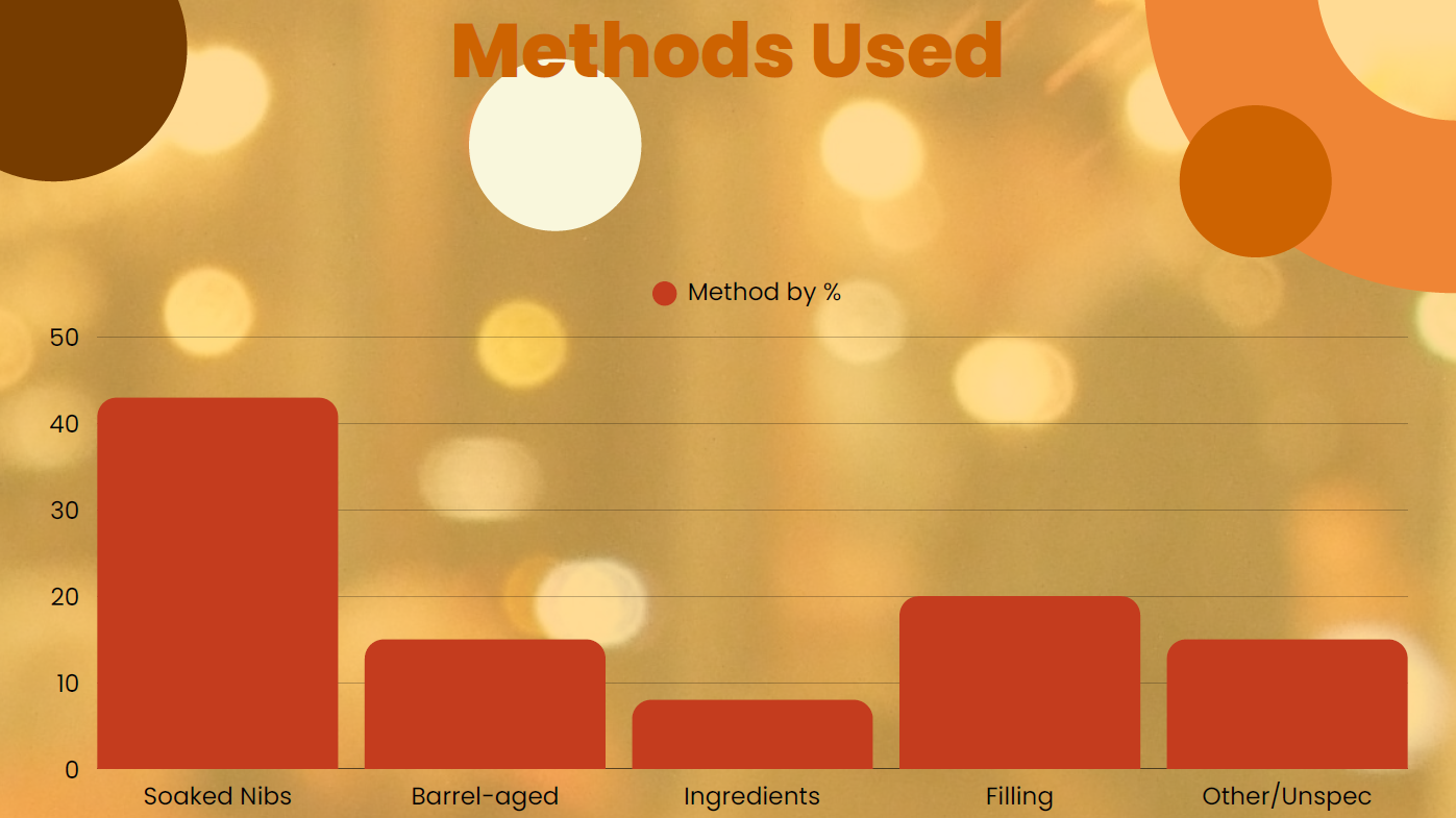 When working with whiskey, by far the most common method is soaking nibs, but barrel-aging and fillings are also very common.